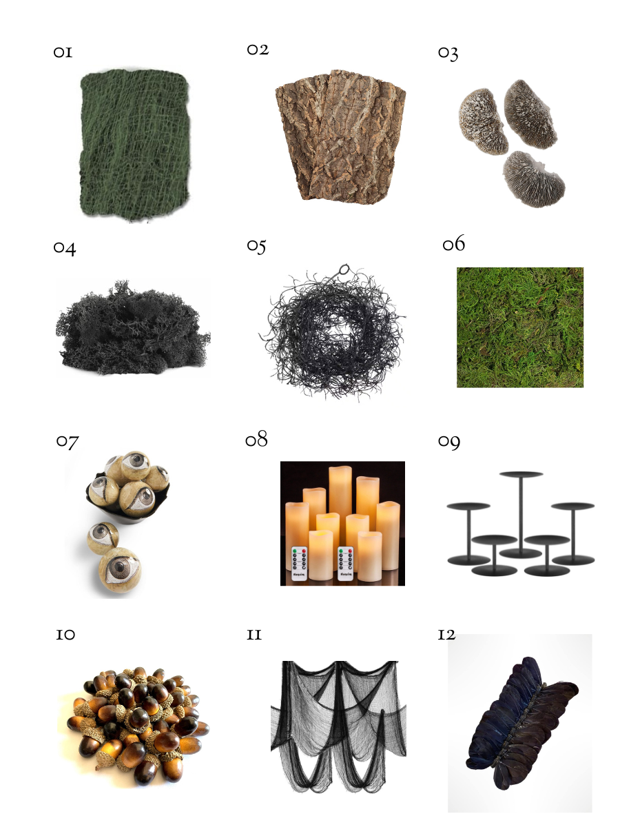 - Build your Base | Lay down a solid foundation to set the mood. We used a combination of green netted fabric, wood bark, and soft moss for an organic feel.